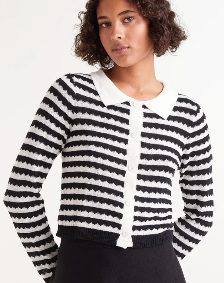 Knitted cardigan with a red and white striped print. With a polo collar and long sleeves. Front button fastening. Ribbed trim detail.