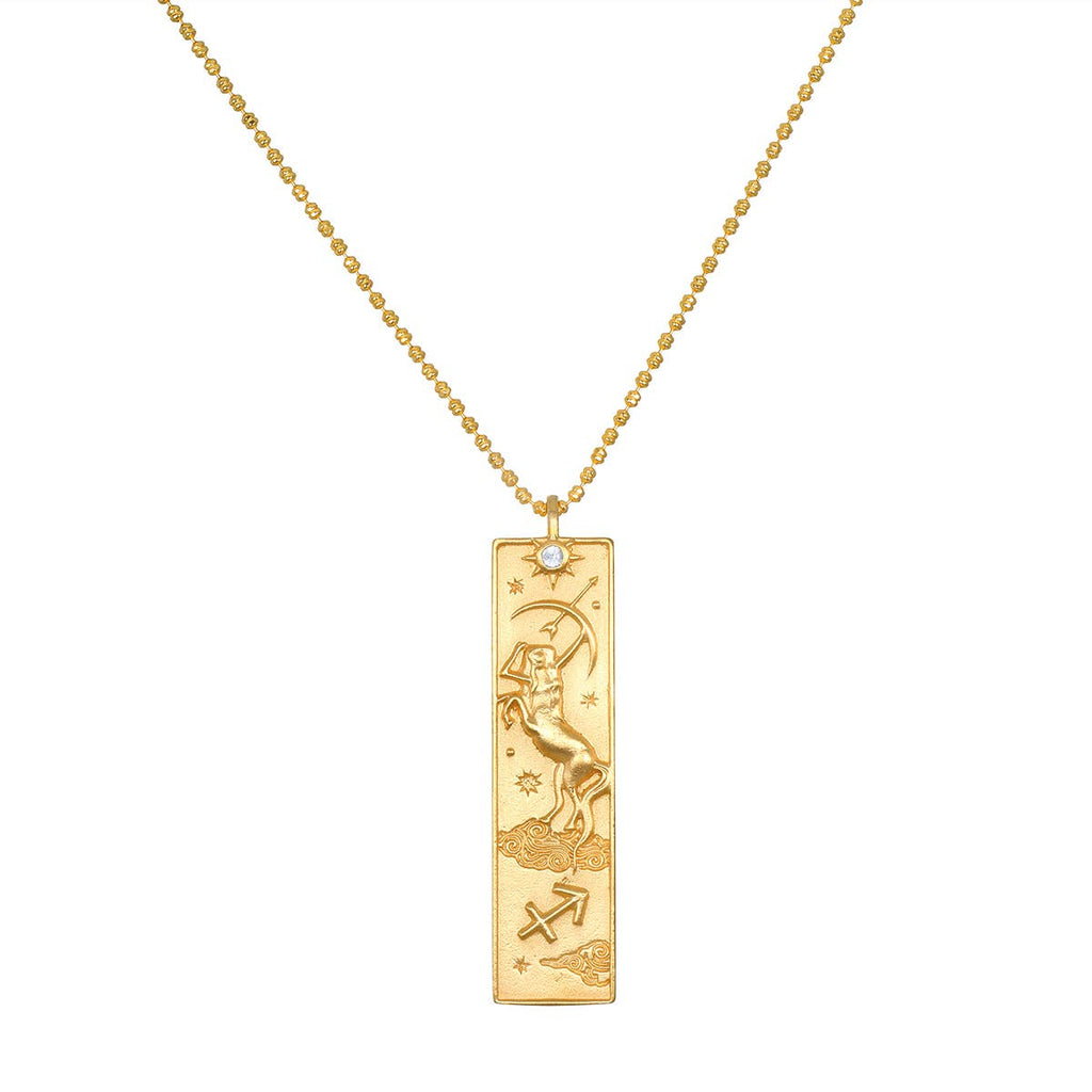 Guided by the ancient wisdom of the zodiac, we discover our story in the stars. An 18kt gold plated zodiac necklace tells the story of each sign. A single white topaz—stone of individuality, creativity, and awareness— shines like a guiding star at the top of the pendant. Wear this adjustable length astrological necklace to tell the story of your personality through your sun, moon, and star signs.
