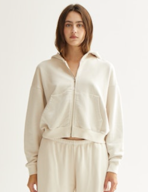 The Rosie is a boxy slightly cropped zip hoodie, featured in our super lux supima cotton terry. Front zip enclosure. Kangaroo Pocket.