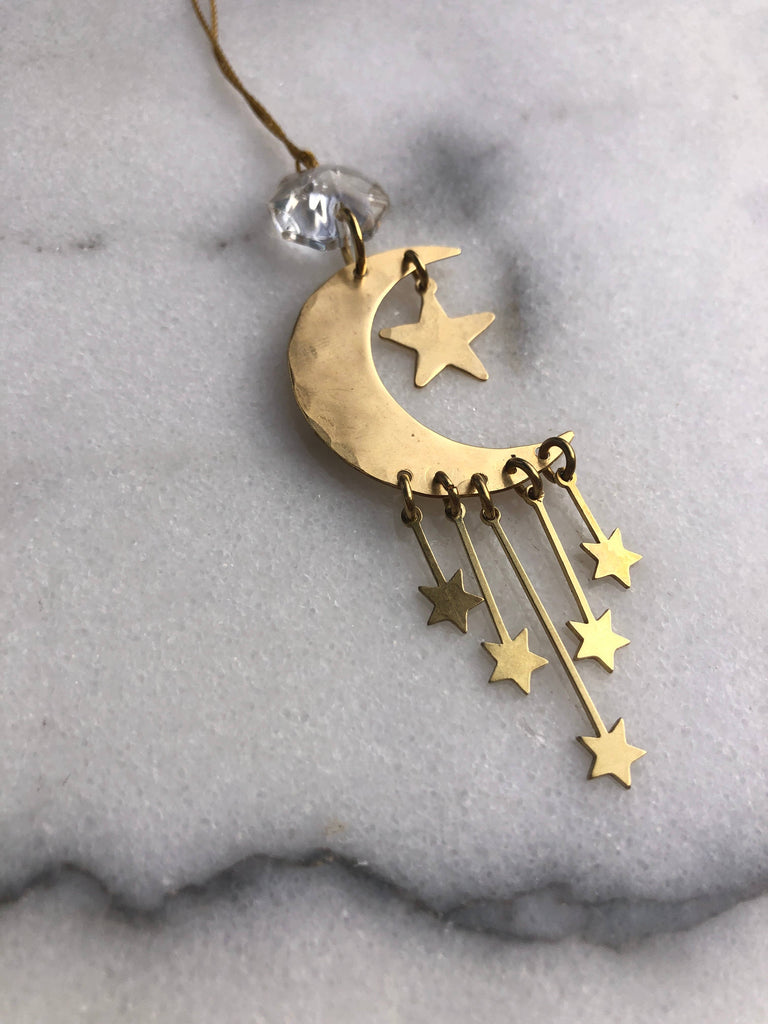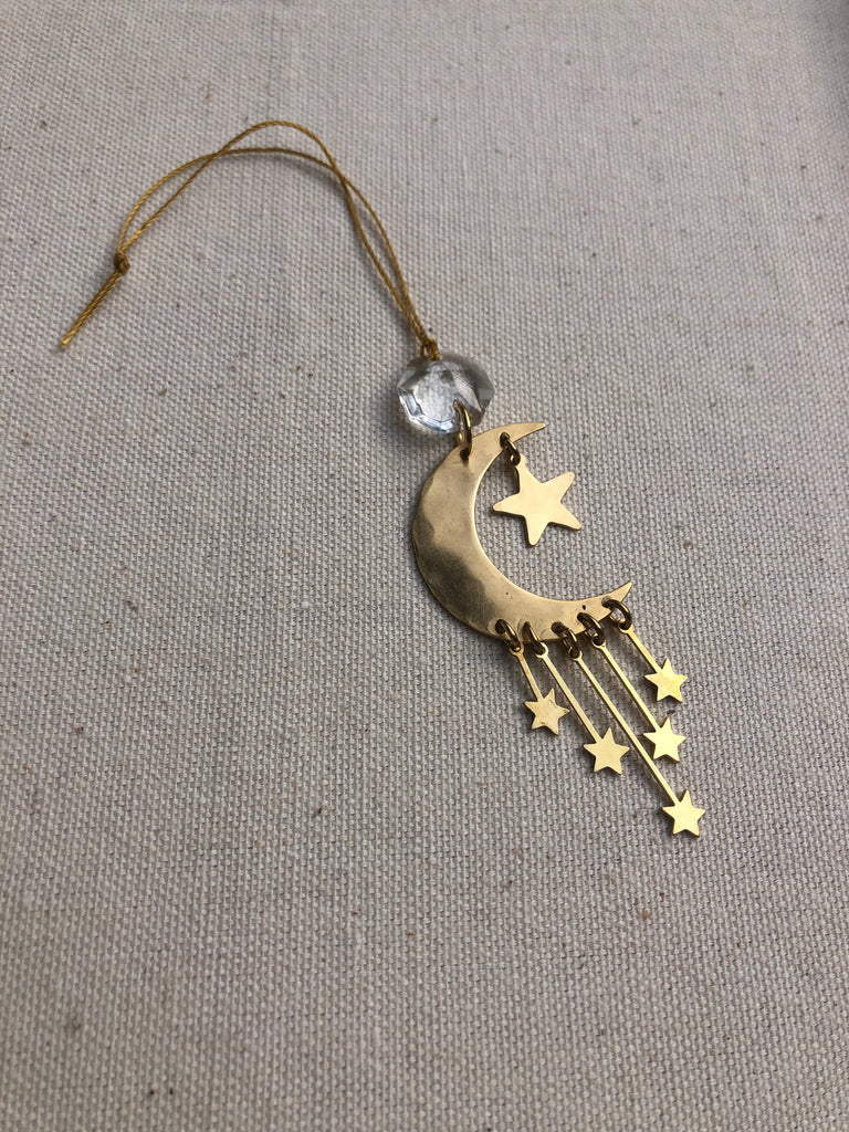 Artisan-crafted ornament made from hand-cut and hammered brass sheet and vintage faceted glass crystal.