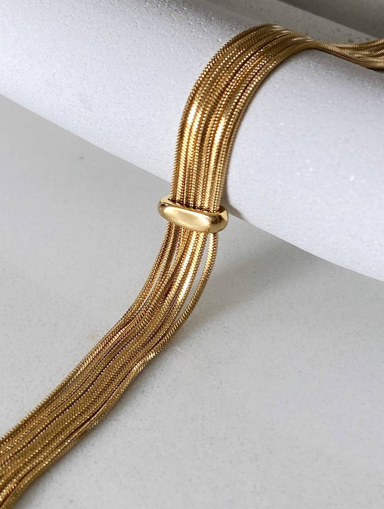 This seven-row snake chain bracelet in 14K gold-plated stainless steel can be worn on its own or combined with our colorful pearl bracelets. It's elegant, minimalist and refreshing all at once.